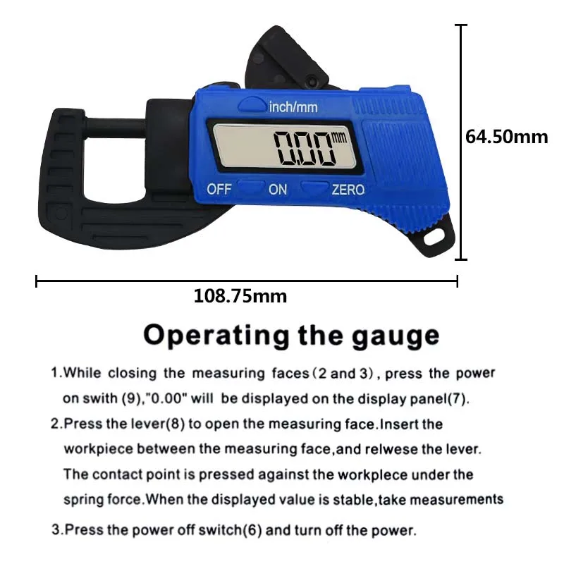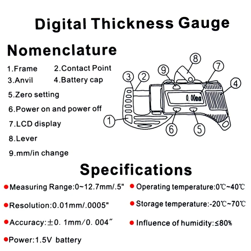 The digital display offers precise measurements in a range of 0-12.7mm, providing accuracy for various applications.