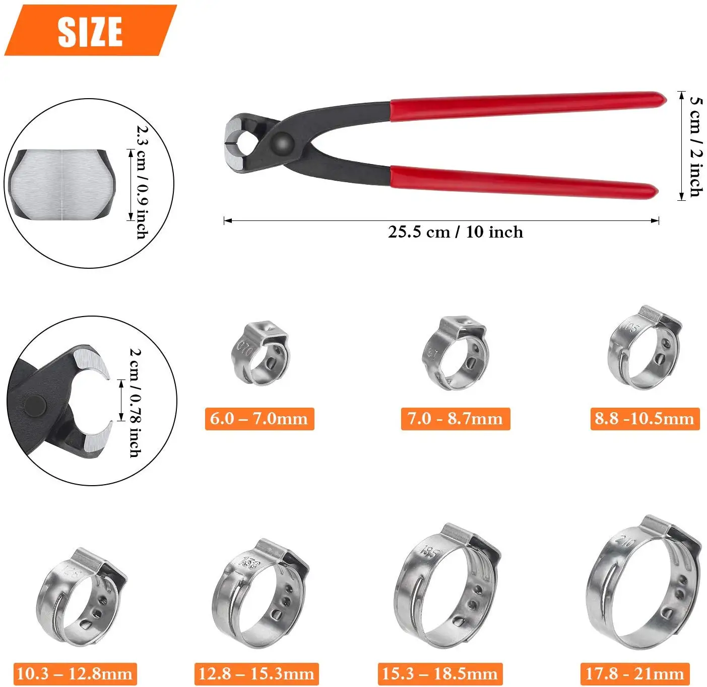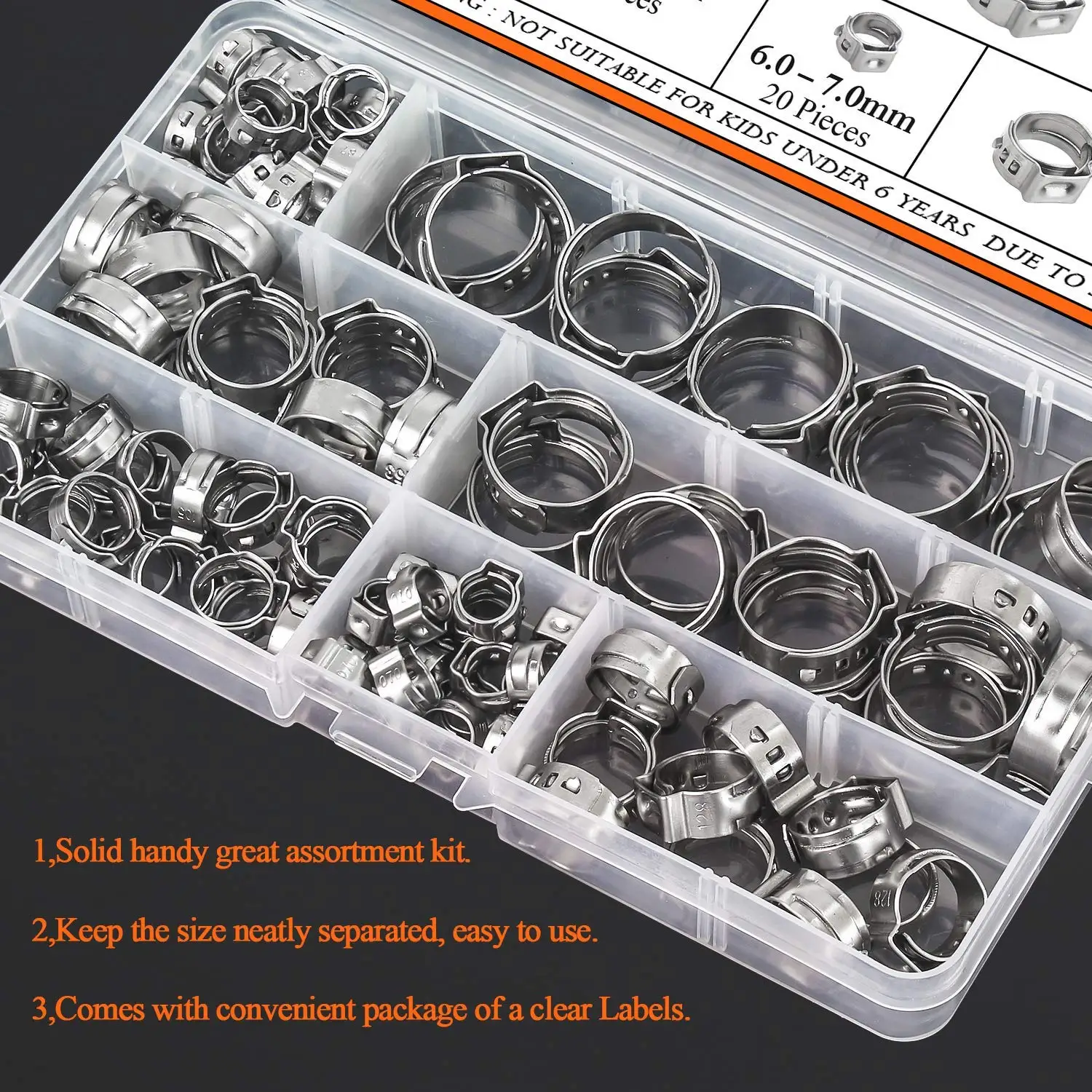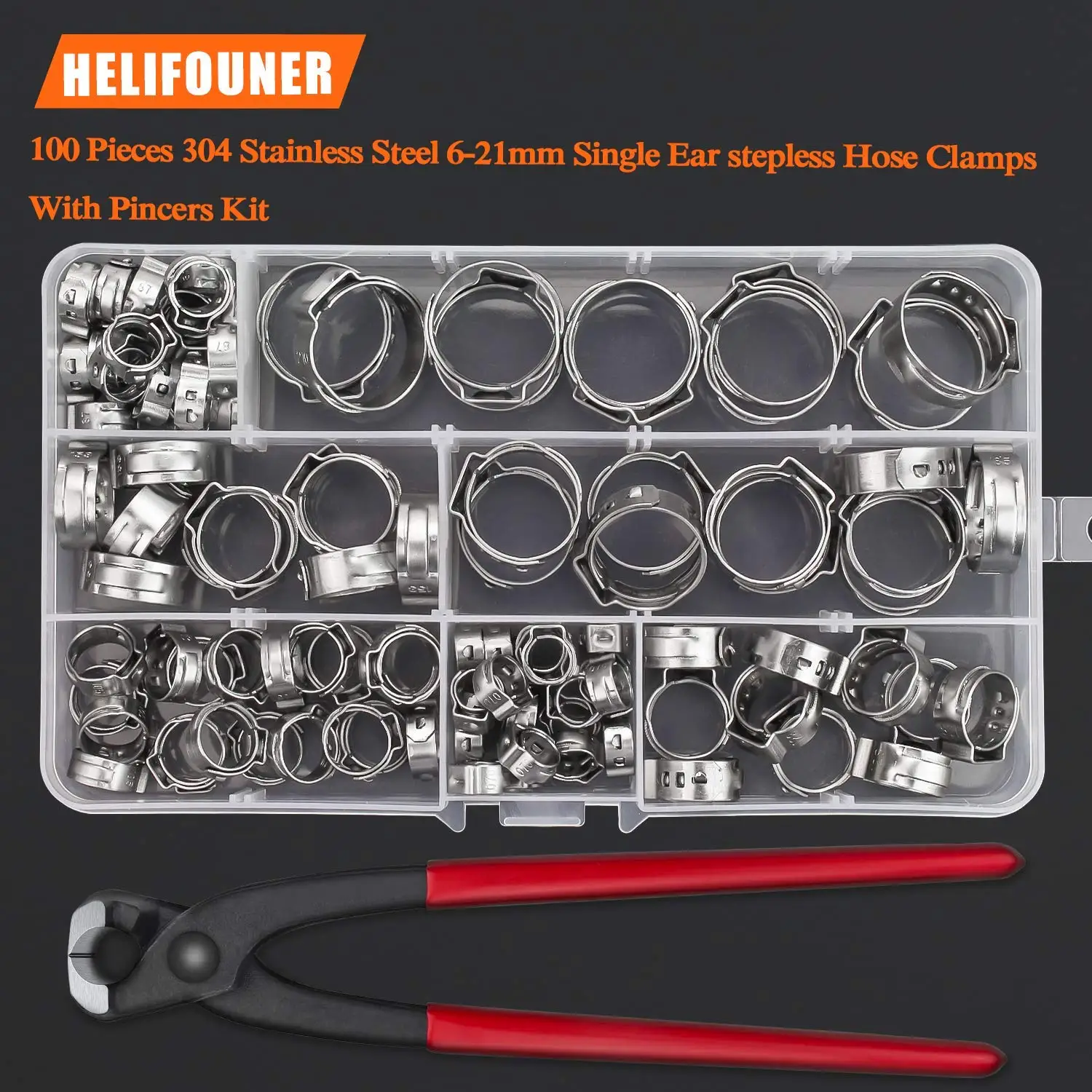 Introducing our 100-Piece 6-21mm 304 Stainless Steel Single Ear Stepless Hose Clamps with Pincers Kit – a comprehensive set designed to meet your various clamping needs.